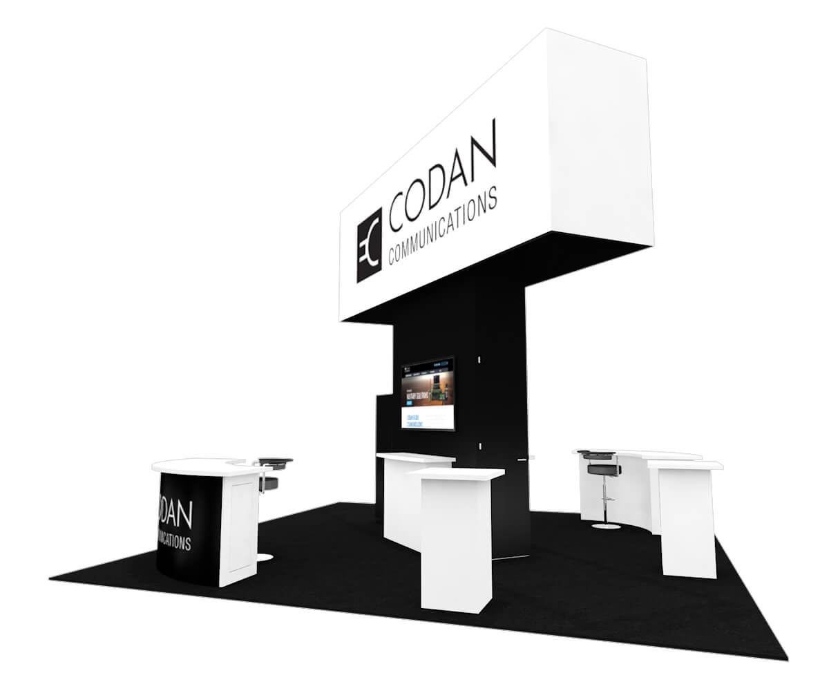 This booth offers great visibility without the costs of rigging a hanging sign. The large rectangular fabric sign is mounted to the large seamless sintra printed graphic tower. The rental demo station has a wall mounted HD LED TV and a locking counter with grommet holes for easy wire management. The sleek curved rental reception counters has locking storage and plenty of space for a logo or bold graphic. The plush loop pile rental carpet comes in many standard rental colors that helps stand out and compliment a design. We will gladly store your graphics until your next show to save you big money on your second trade show rental display!