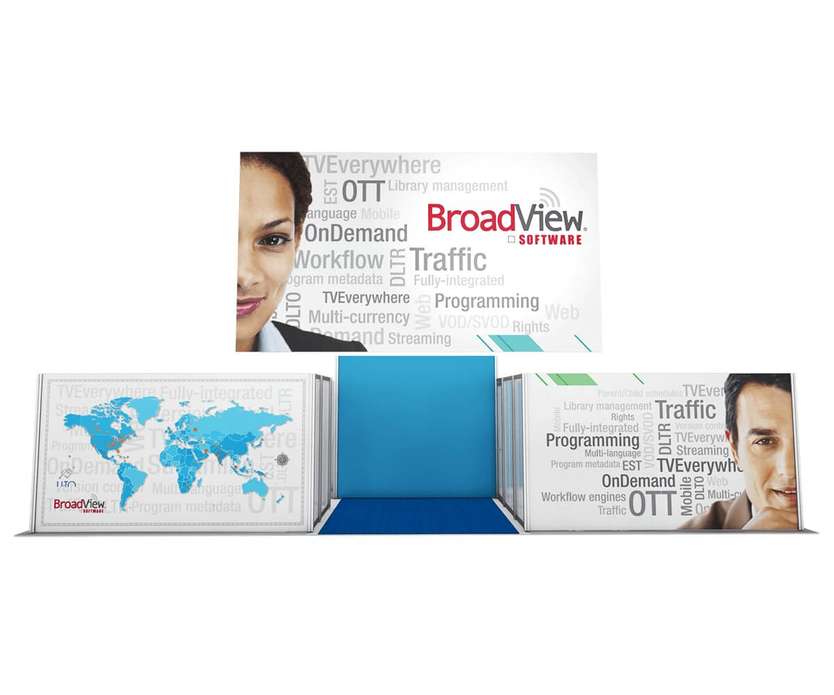 This unique rental trade show display showcases a great use of space. The huge fabric rental hanging sign gives great visibility. The oversized rental reception counters with thei sleek locking doors provide plenty of space for storage and for a company logo or bold graphic. The double sided rental computer demo stations at the front of the booth offers a built in shelf one one side and a built in meeting table on the other. The rental black leather lounge rental furniture offers great style while networking and the plush loop pile rental carpet offers comfort for tired feet. The three large, private conference rooms to the back of the booth, built of a solid aluminum frame structure that is hidden by seamless printed sintra mural panels, is an intimate place for larger meetings and the frosted decorative infills give a custom feel. We will gladly store your graphics until your next show to save you big money on your second rental!